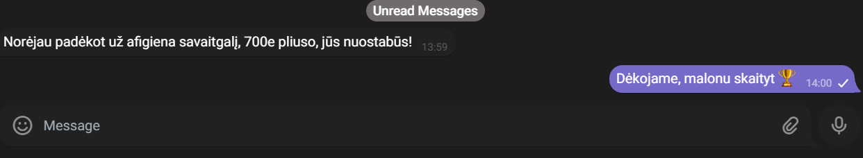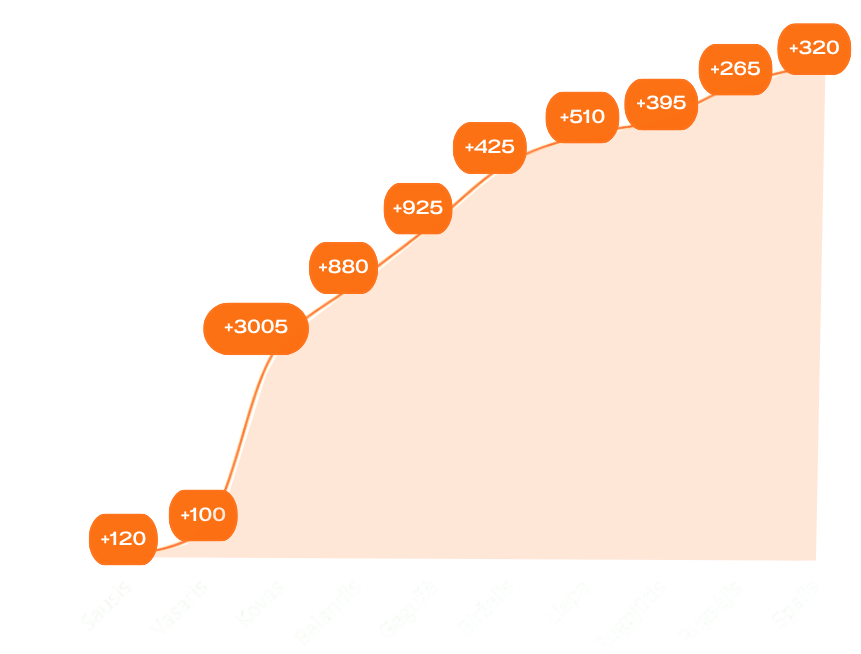 Tai mūsų bendros pastangos rezultatas. Kiekvienas mėnuo atspindi discipliną, strategiją ir bendrą tikslą augti kartu. Skaidriai dalinamės tuo, ką pasiekiame, nes pasitikėjimas remiasi faktais.